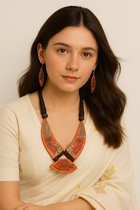 Orange Hand Painted Fabric Adjustable Length Choker Necklace Set