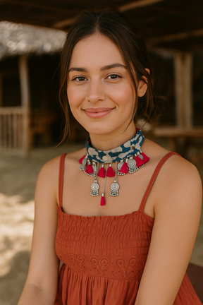 Indigo Fabric Stamped Metal Coins Charms Embellished Fabric Choker Necklace