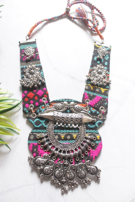 Intricately Detailed Metal Accents Braided with Black Fabric Threads Necklace Set