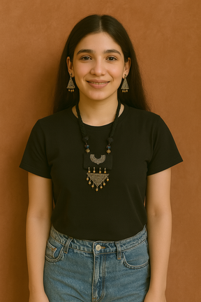 This necklace set features ikat fabric beads paired with antique gold finish metal accents. The mix of textures gives it a handcrafted, earthy charm, while the subtle sheen of the metal adds a festive edge. Lightweight and balanced, it’s a piece you can dress up or down with ease.