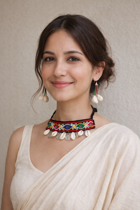 Hand Embroidered Fabric Choker Necklace Set with Shells and Coins