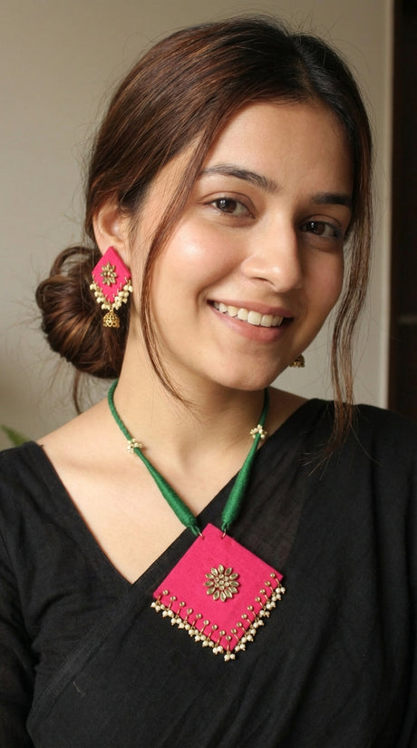 Handmade Pink Fabric Necklace Set with Gold Metal Accents