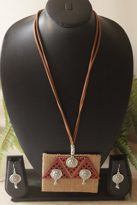 Maroon Kalamkari Fabric Necklace Set Embellished with Leaf Metal Charms