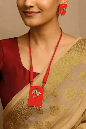 Red Fabric Necklace Set with Metal Leaves and Beads Detailing