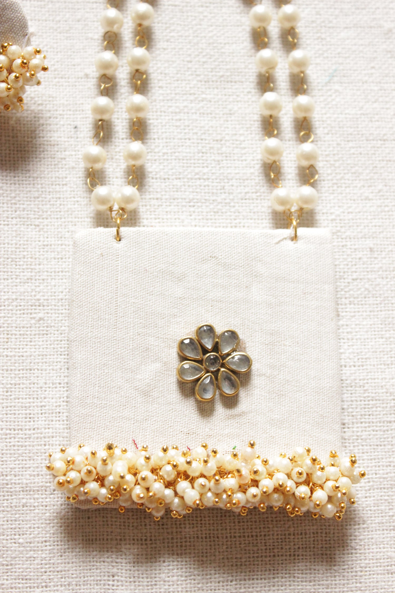 White and Gold Toned Adjustable Dori Closure White Fabric Necklace Set