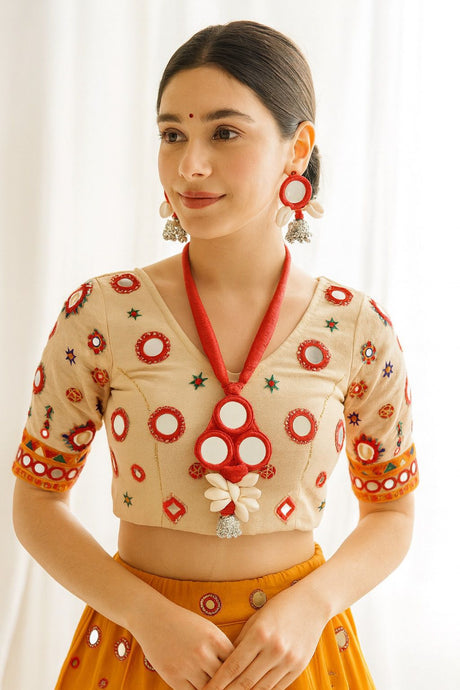 450 INR550Unit price /UnavailableRed Fabric and Mirrors Hand Embroidered Adjustable Length Necklace Set