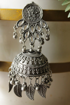 White Stones Embedded Premium Oxidised Finish Jhumka Earrings