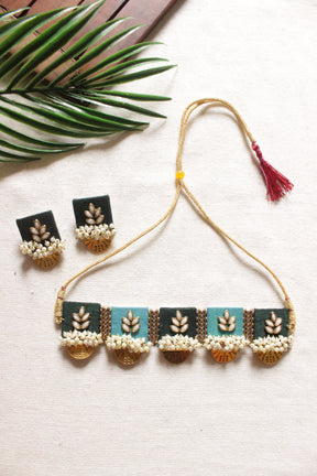 Green & Turquoise Gold Tones White Beads Embellished Fabric Choker Necklace Set with Adjustable Closure