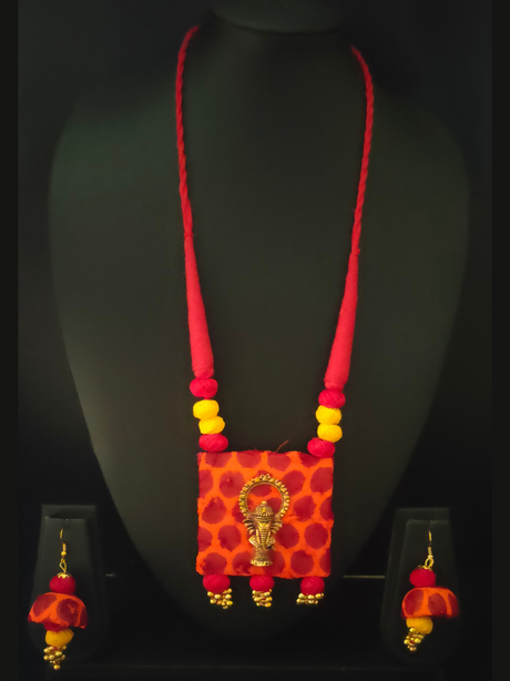 Fabric Necklace Set with Antique Gold Finish Ganesha Motif