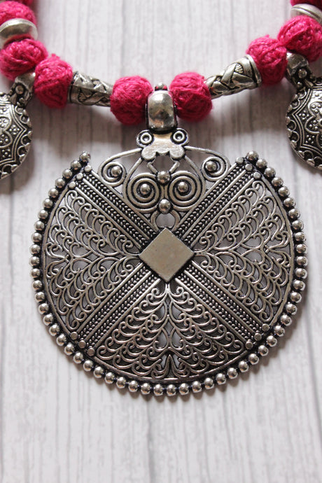 Intricately Detailed Metal Pendant and Charms Pink Thread Braided Necklace