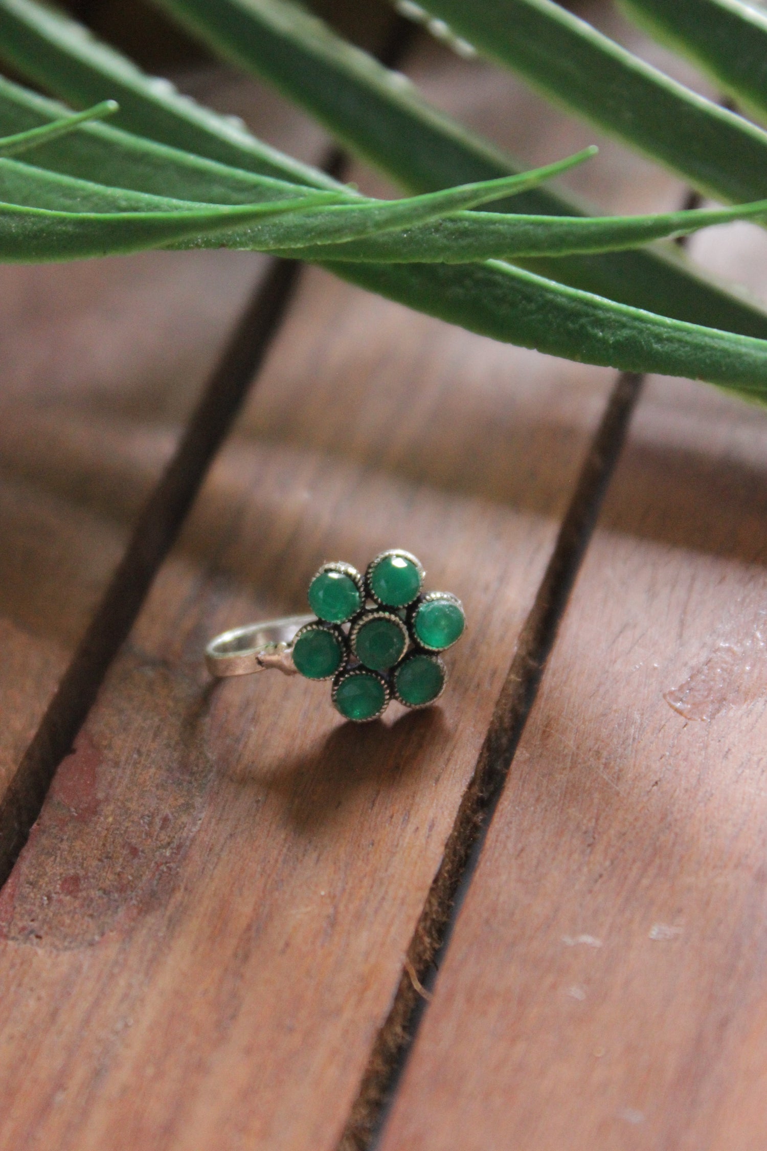 Green Stones Flower Shape Oxidised Finish Silver Clip On Nosepin