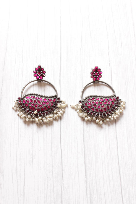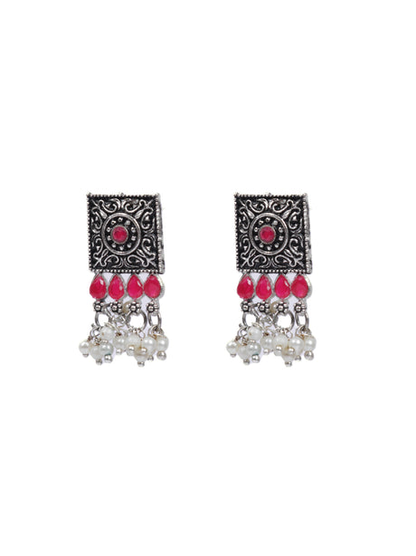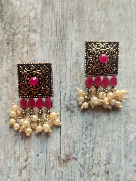 Fuchsia and White Beads Festive Metal Dangler Earrings