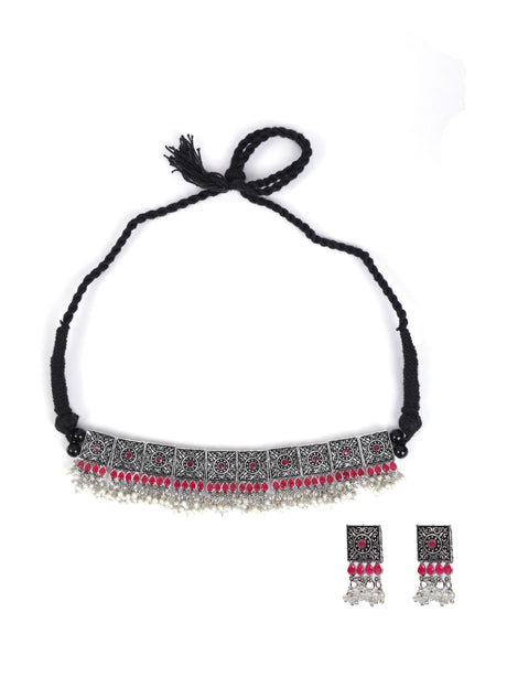 3 Layer Pink and Orange Oxidised Silver Necklace Set with Thread Closure