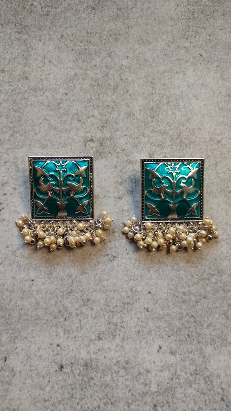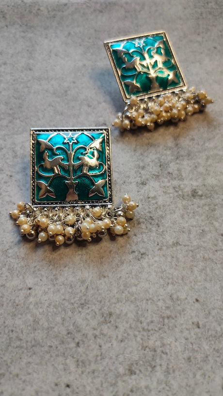 Antique Gold Finish Pink and Green Fabric Ethnic Earrings