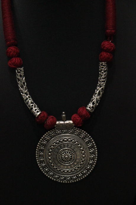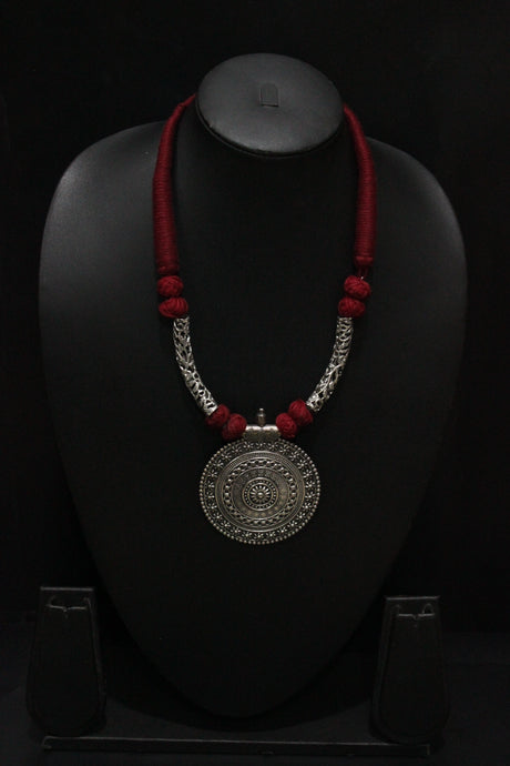 Hasli Style Thread Closure Choker Necklace Set with Statement Circular Metal Pendant