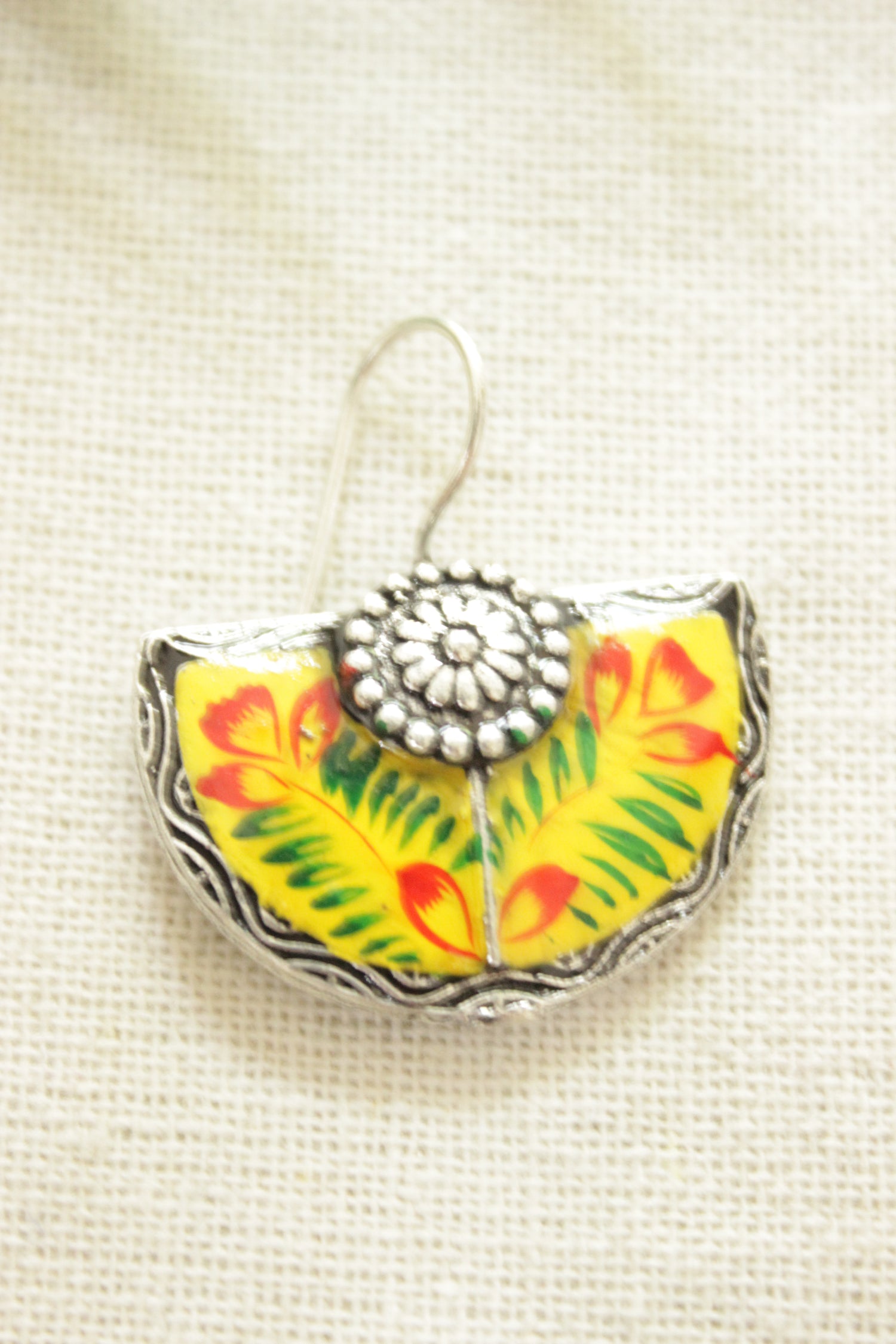 Yellow Enamel Painted Flower Motifs Half Moon Oxidised Finish Metal Earrings