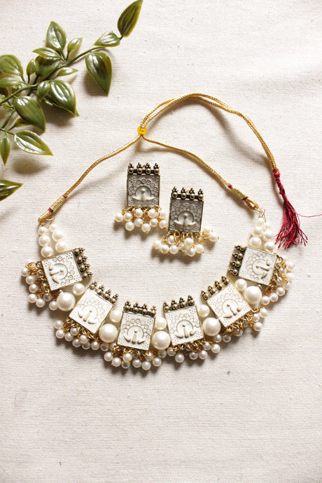 375 INR550Unit price /UnavailableWhite and Gold Toned Bird Motif Embossed Dori Closure Adjustable Length Choker Necklace Set