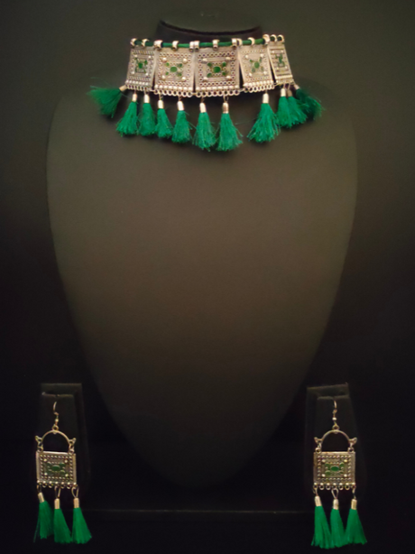 335 INR500Unit price /UnavailableOxidised Silver Choker Necklace Set with Green Thread Work