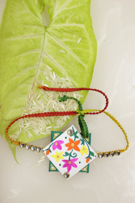 274 INR299Unit price /UnavailableFabric and Terracotta Clay Hand Painted Flower Motifs Rakhi