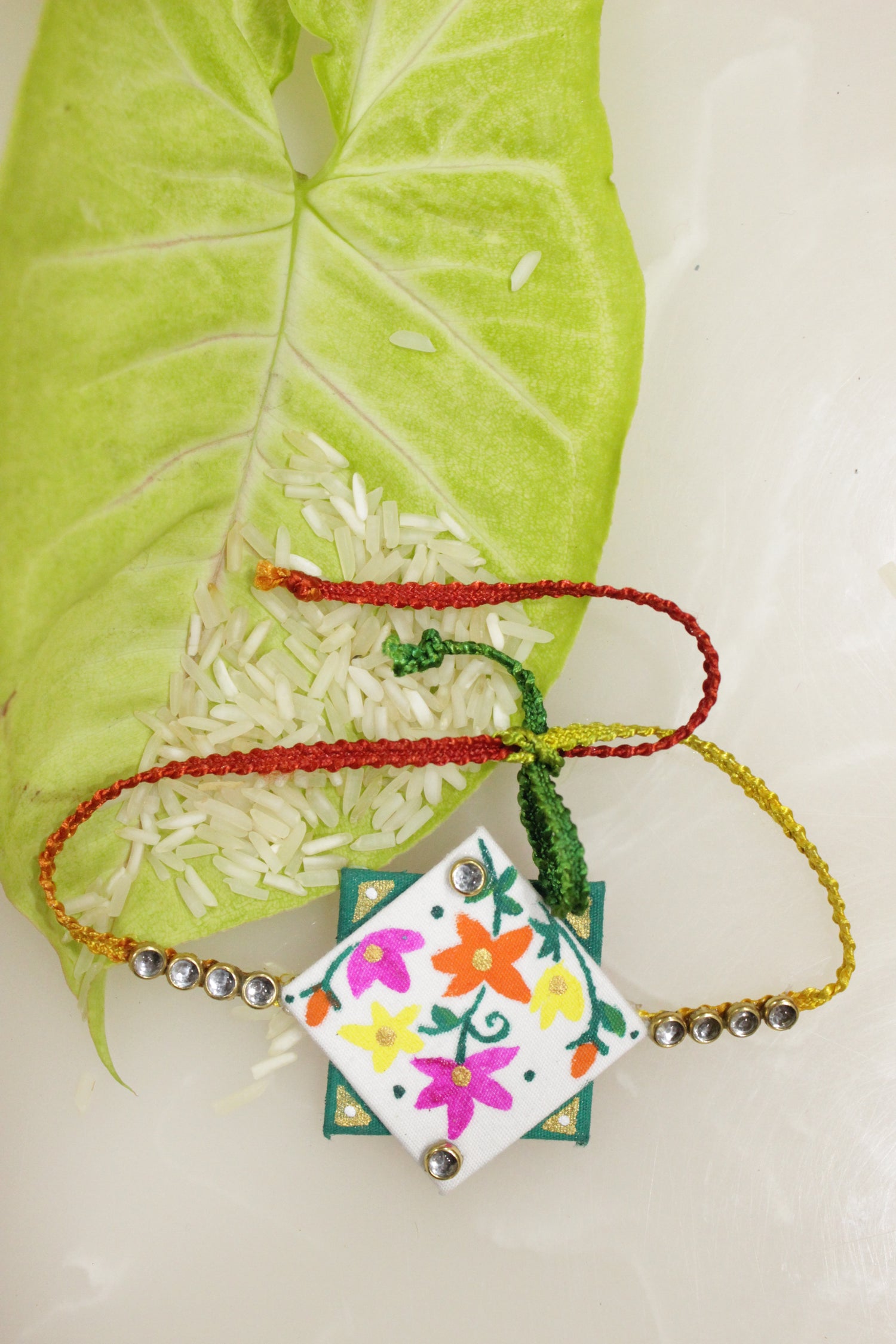 Fabric and Hand Painted Flower Motifs and Kundan Work Dori Rakhi