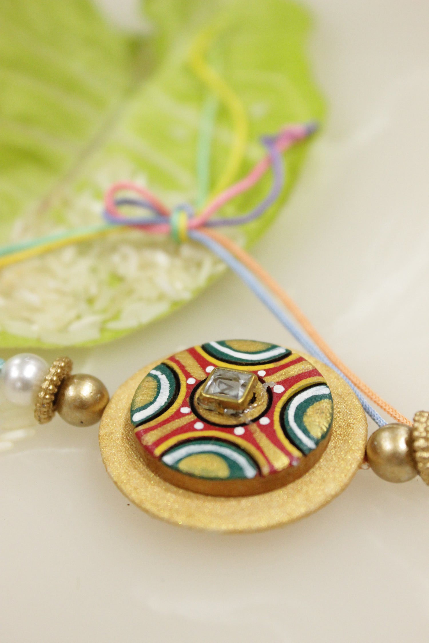 Fabric and Terracotta Clay Golden Hand Painted Rakhi