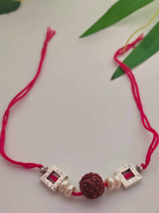 A subtle and simple yet elegant rakhi with aRudraksha Beadcenterpiecealong withwhite pearlsdetailing andcotton threads.