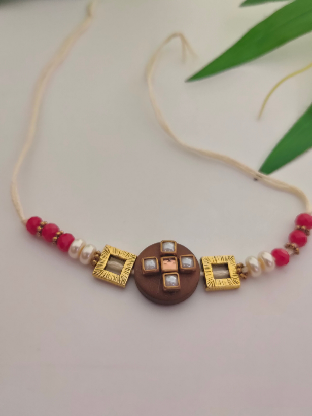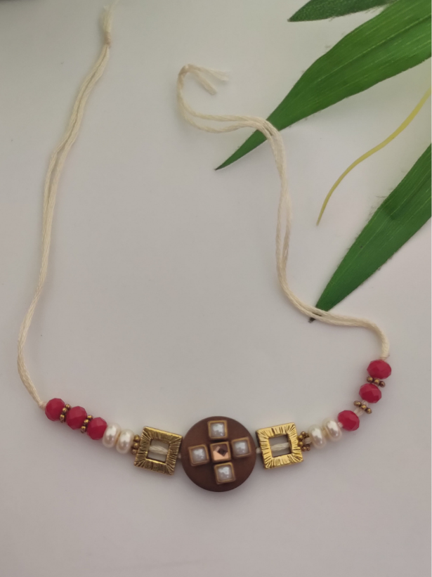 Simple Yet Elegant Wooden Centerpiece Rakhi with Metal and Beads Detailing