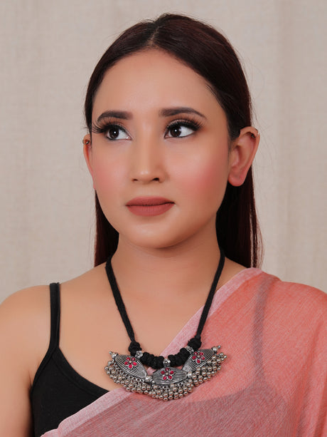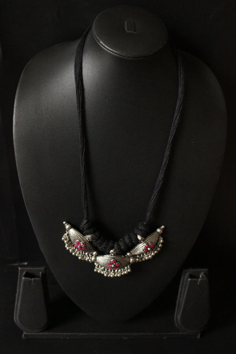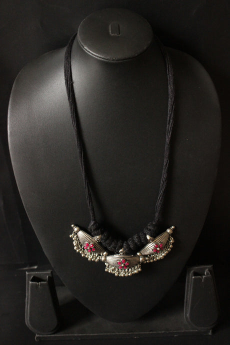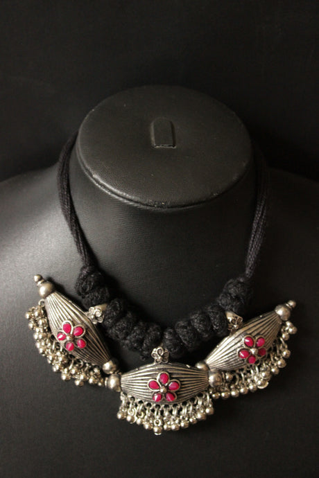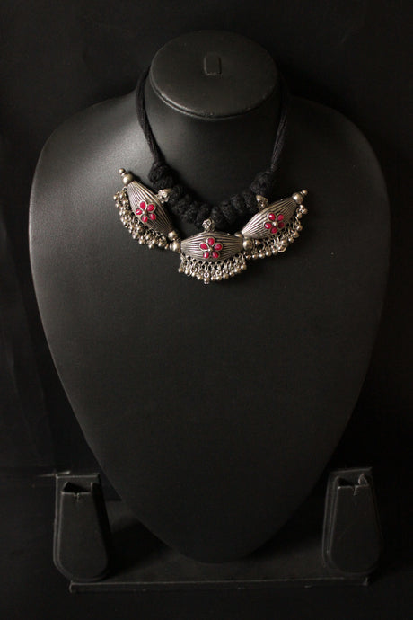 Hand Braided Silver Finish Dholak Motif Thread Closure Choker Necklace