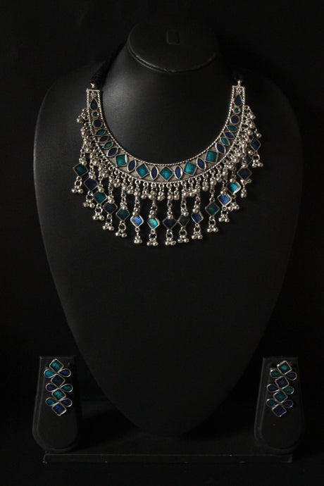 Square and Dome Shaped Metal Embellishments Oxidised Finish Adjustable Length Choker Necklace Set