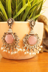 Baby Pink Center Stone Embedded Oxidised Finish Earrings