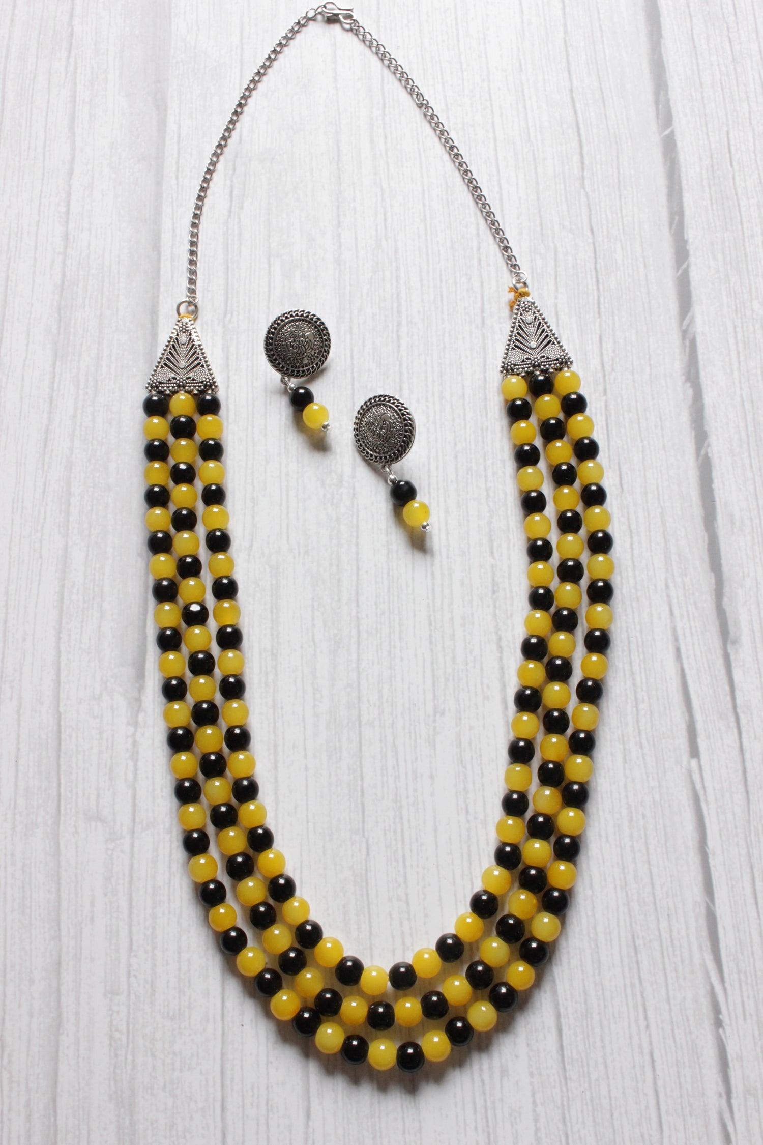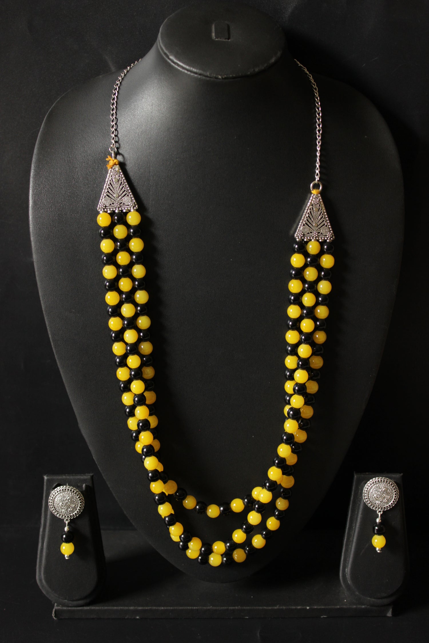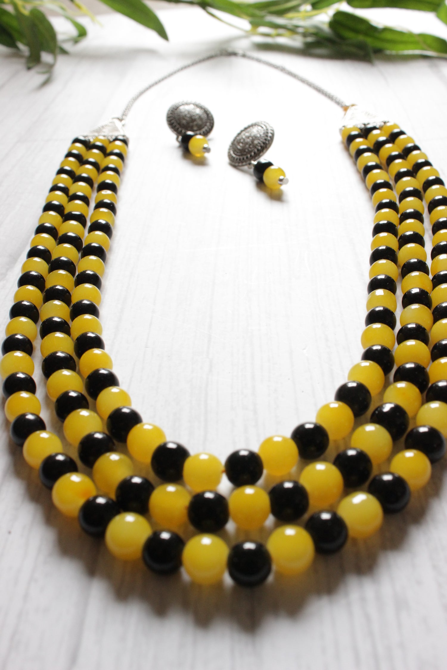 Black and Yellow Glass Beaded 3 Layer Necklace Set