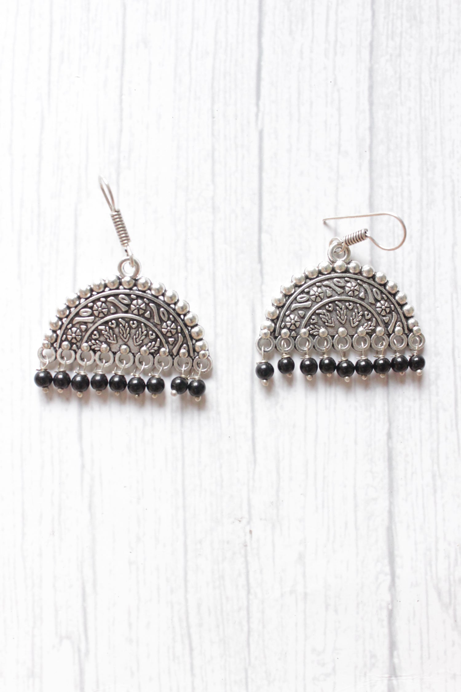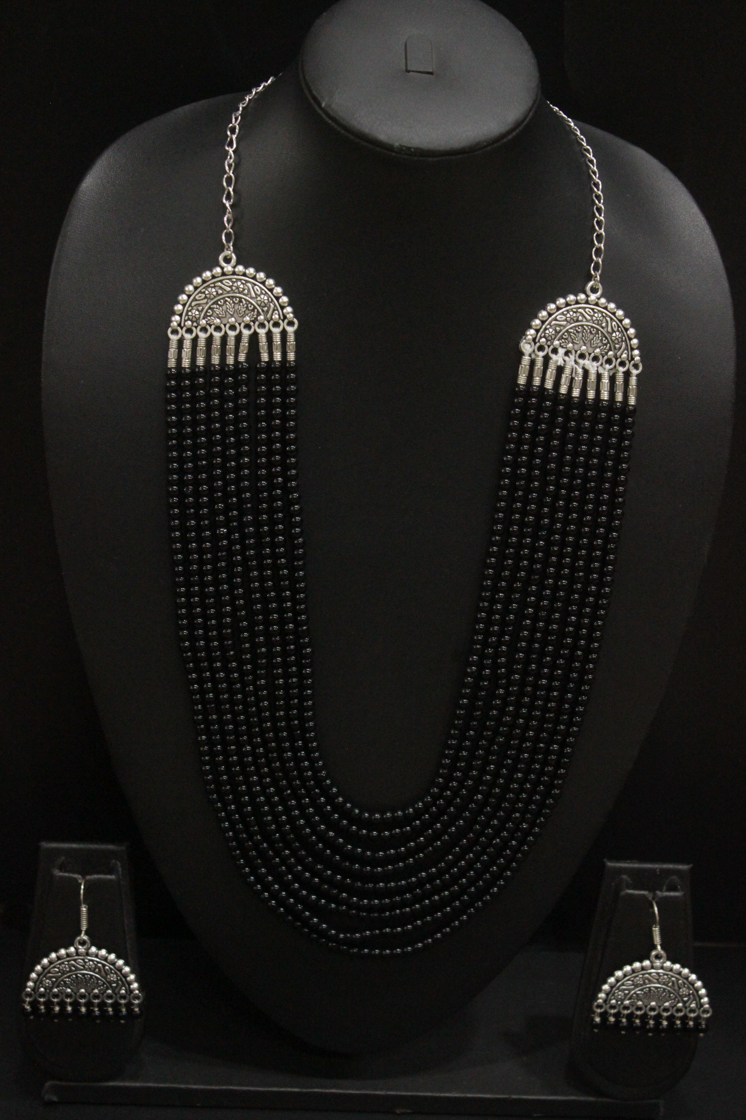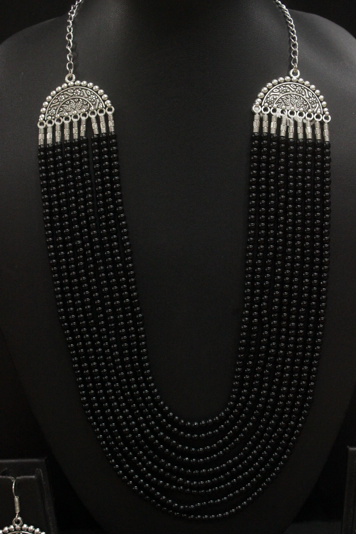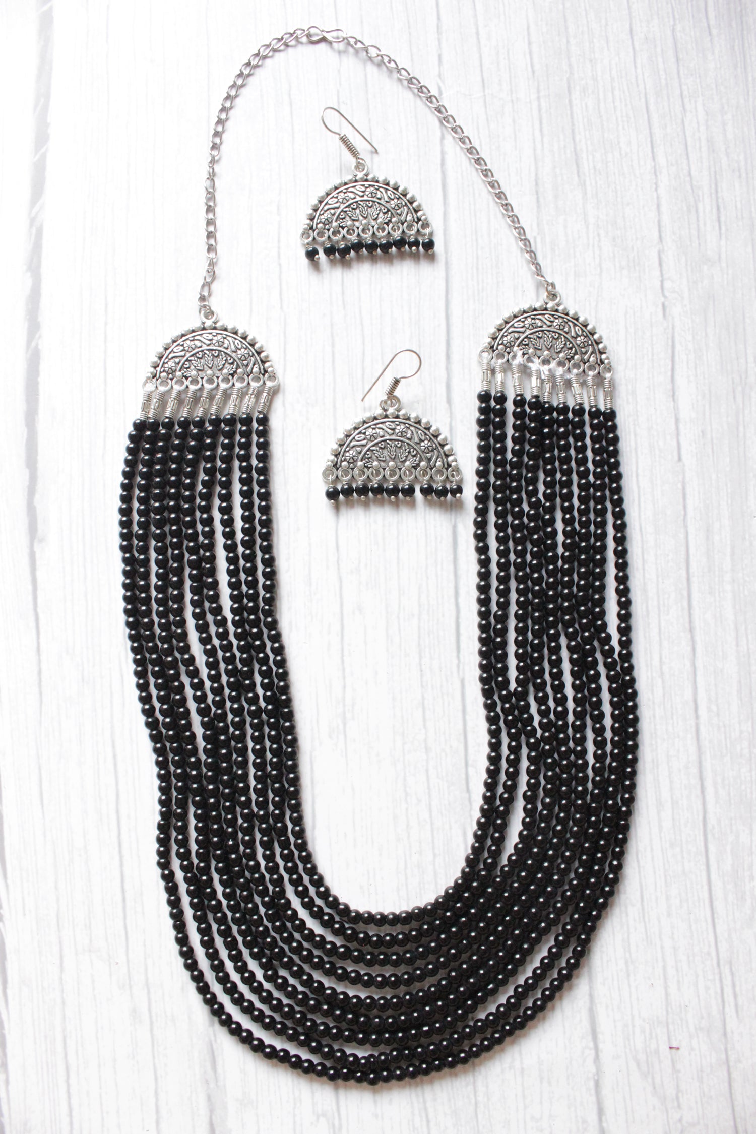 Black Beads Braided 5 Layer Necklace Set with Metal Accents