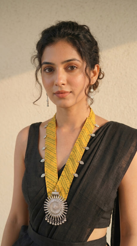 Block Printed Fabric and Shell Work Handmade Necklace Set with Adjustable Thread Closure Necklace Set
