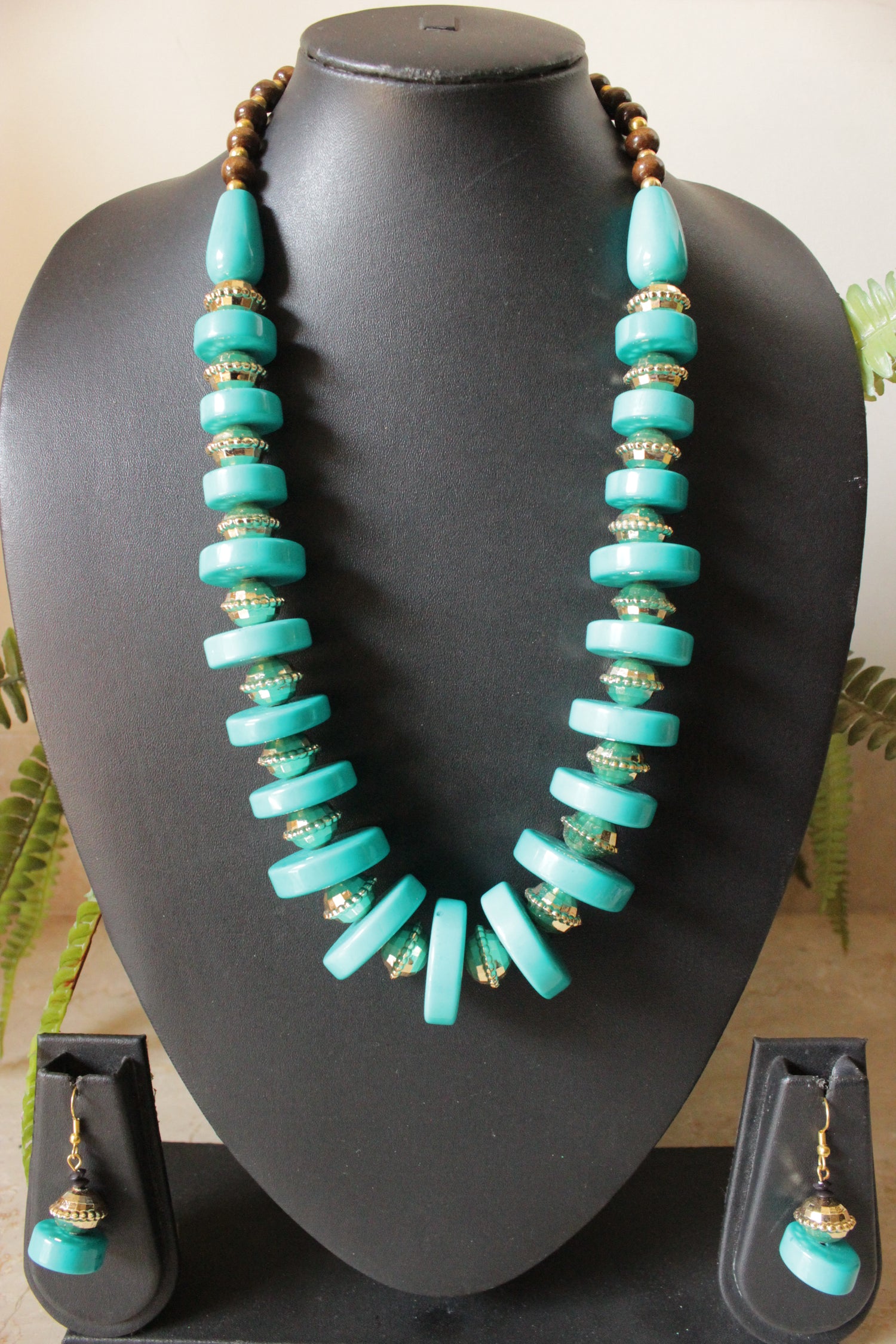 Blue Acrylic Beads Gold Metal Accents Necklace Set