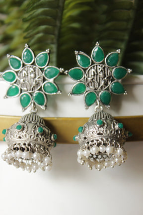 Bottle Green Glass Stones Embedded Silver Finish Flower Motif Dangler Jhumka Earrings in Brass