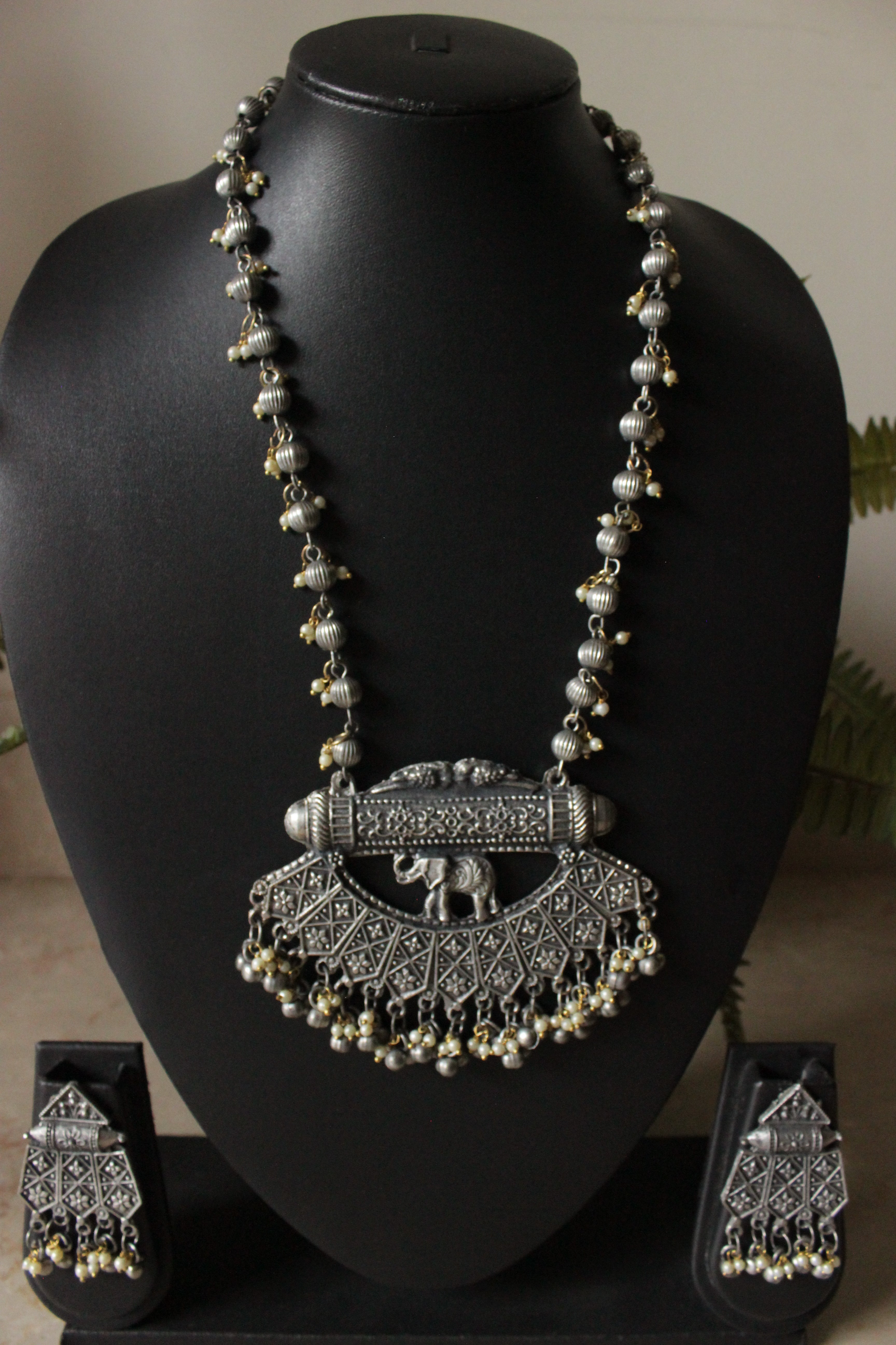 Elephant Motif Intricately Detailed Long Oxidised Finish Chain Necklace Set with Dori Closure