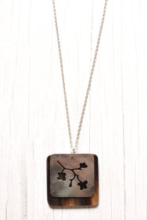 Flower Inscribed Pendant Long Chain Metal Necklace