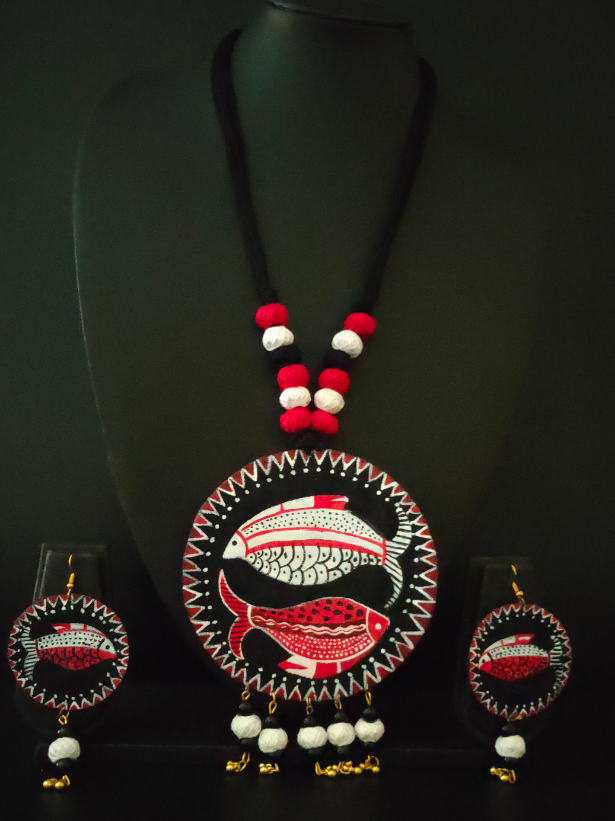 Hand Painted Fishes Fabric Necklace Set with Thread Closure