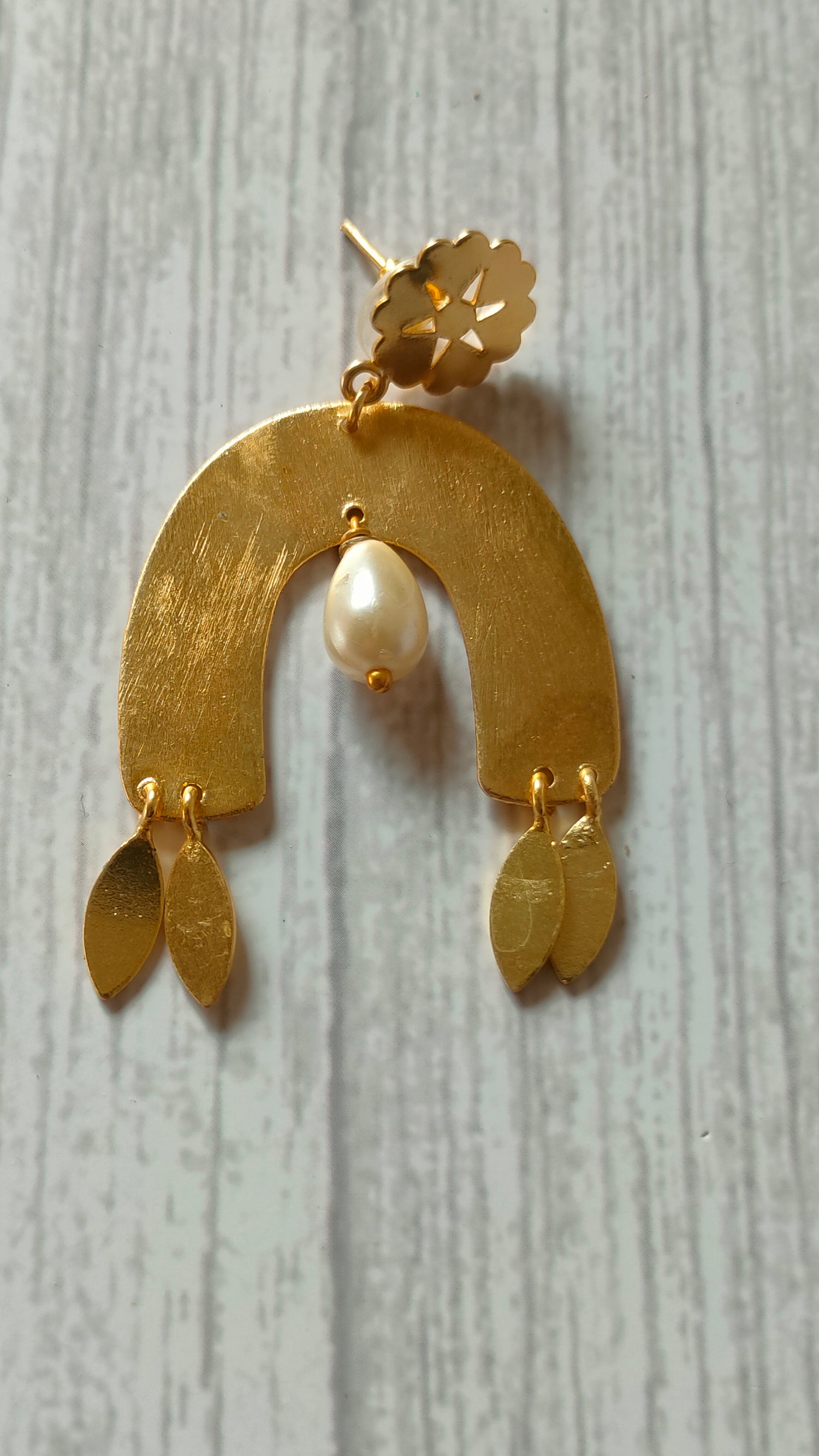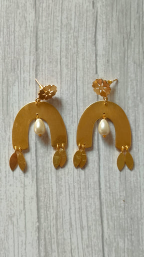 Horse Shoe Brass Earrings with Leaf Danglers and Pearl Beads
