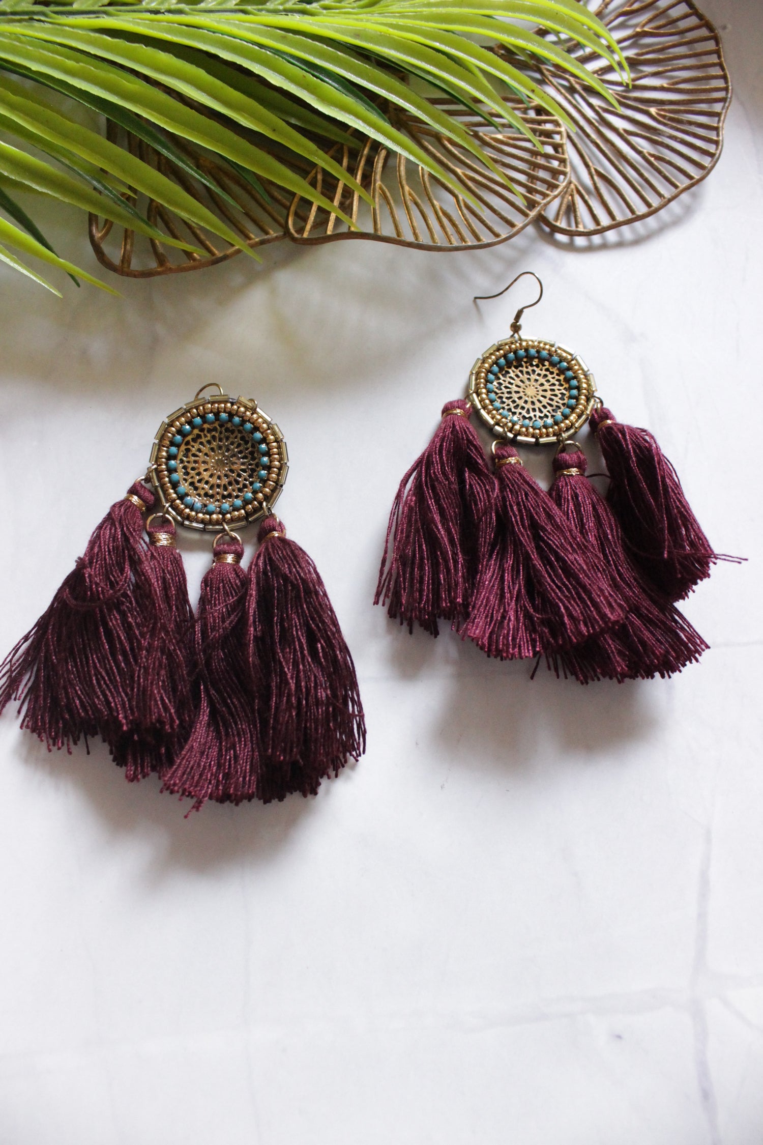 Maroon Pom Poms Embellished Beaded Dangler Earrings