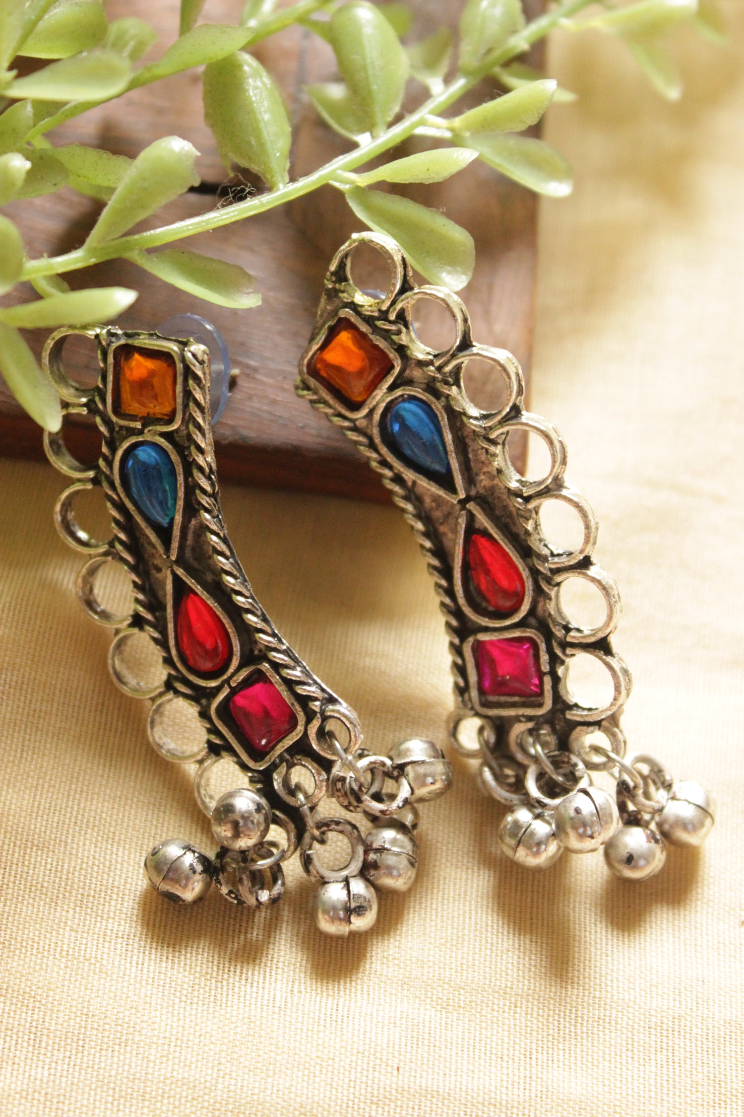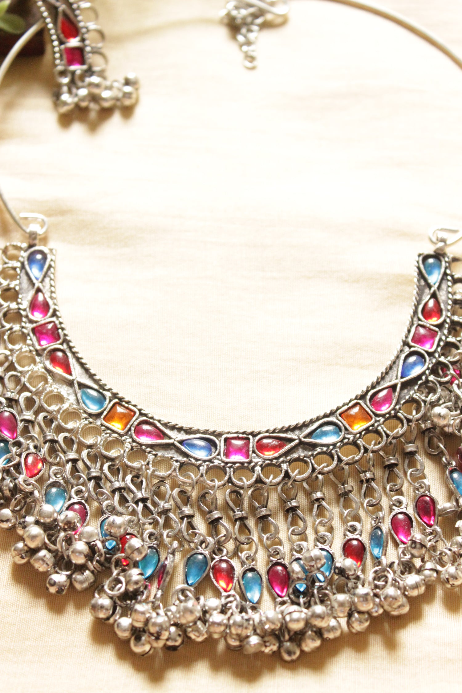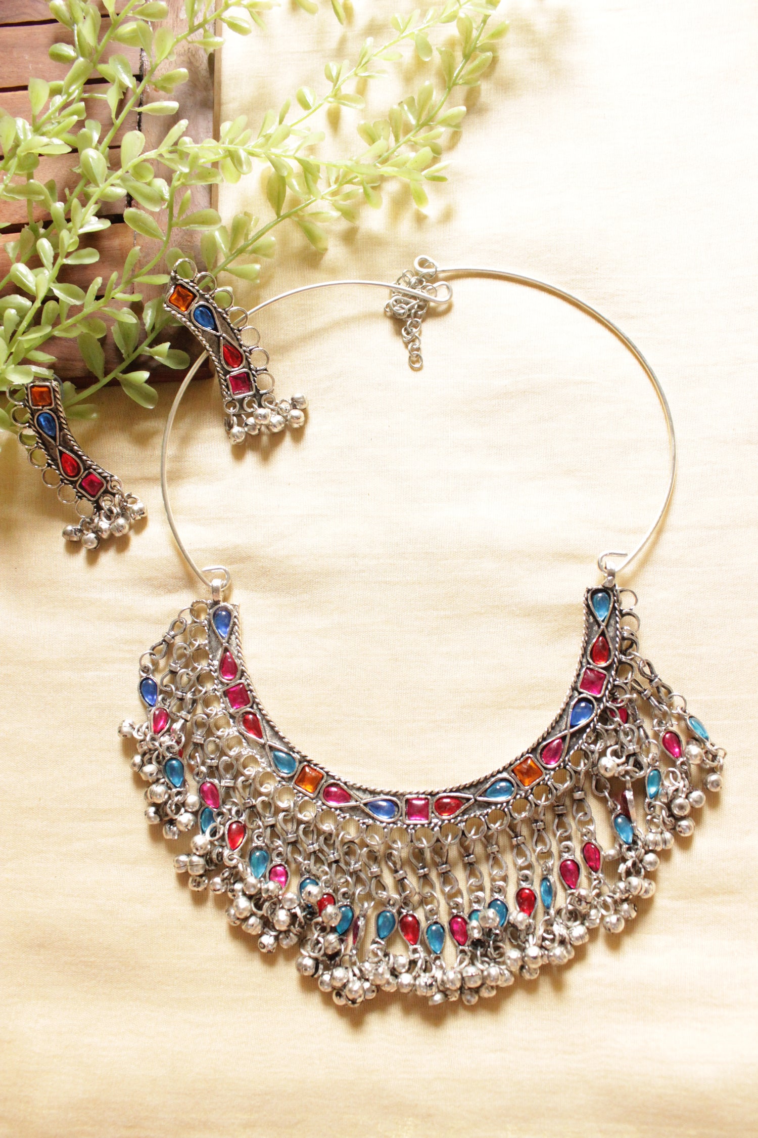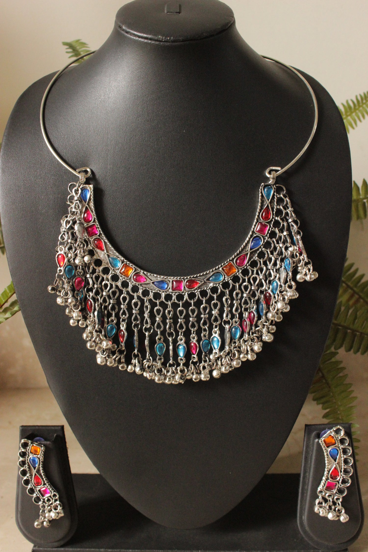 Multi-Color Glass Stones Embedded Hasli Style Oxidised Silver Finish Long Afghani Necklace Set