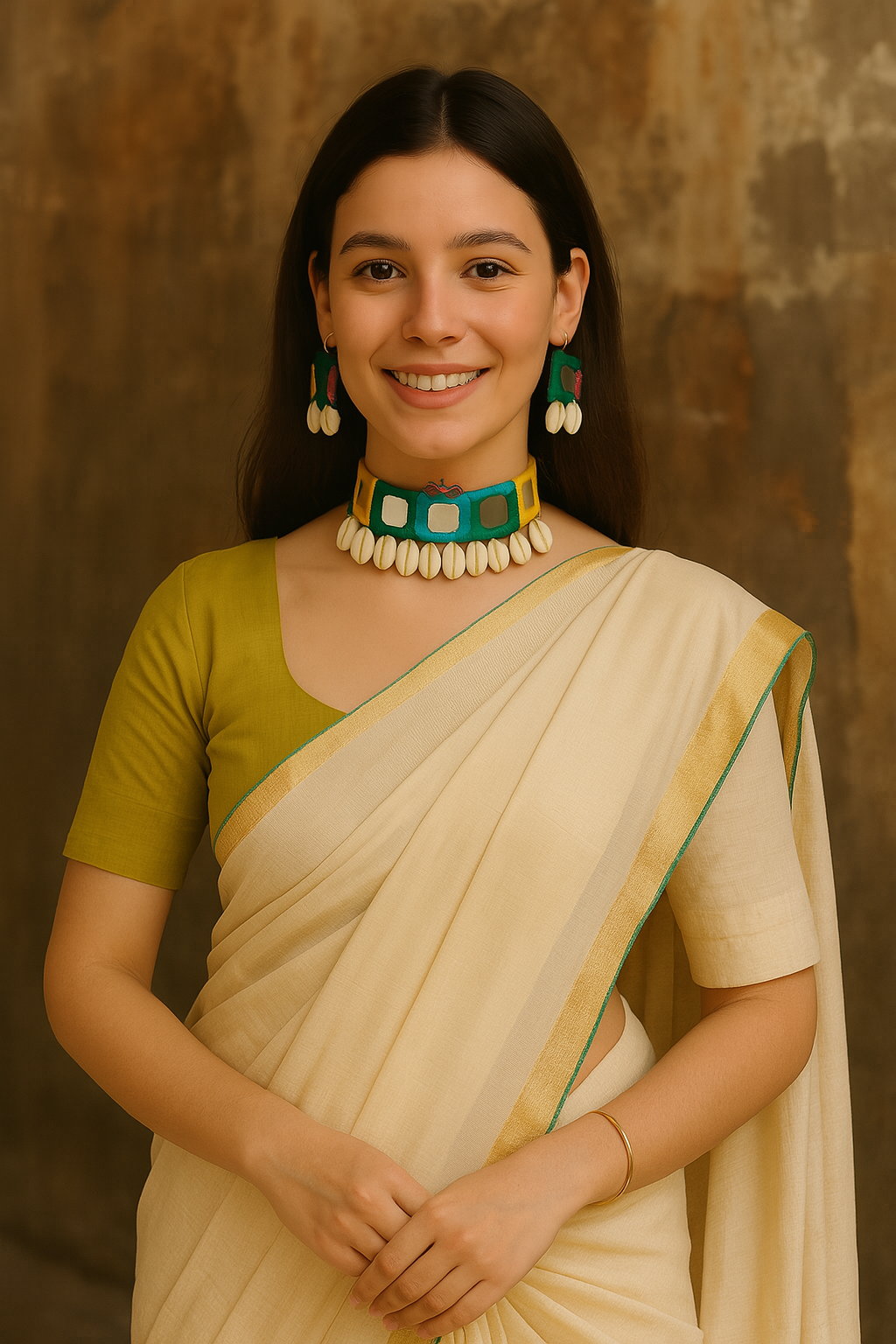 Celebrate vibrant craftsmanship with this handcrafted choker necklace set, featuring intricate mirror embroidery and delicate shell embellishments. Made from eco-friendly fabric, this skin-friendly set offers a unique blend of traditional artistry and contemporary design.