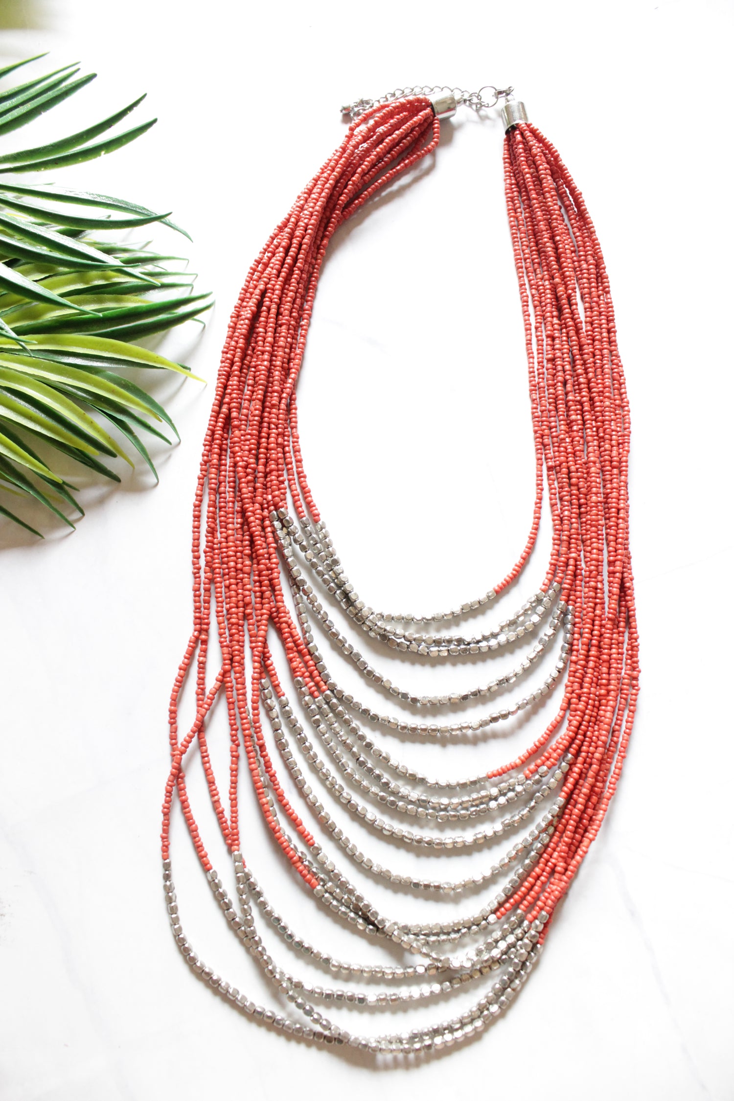 Orange and Silver Beads Mult-Layer Beaded Handmade Boho Necklace