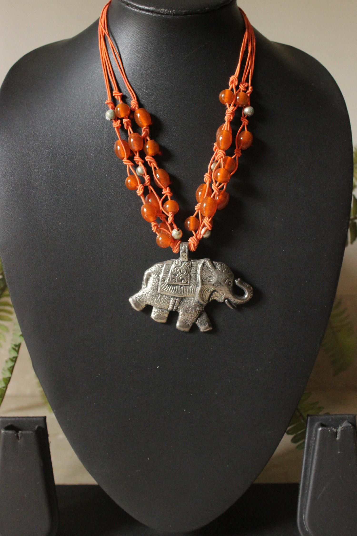 Orange Glass Beads Braided in Rope Threads with Statement Elephant Pendant Boho Necklace