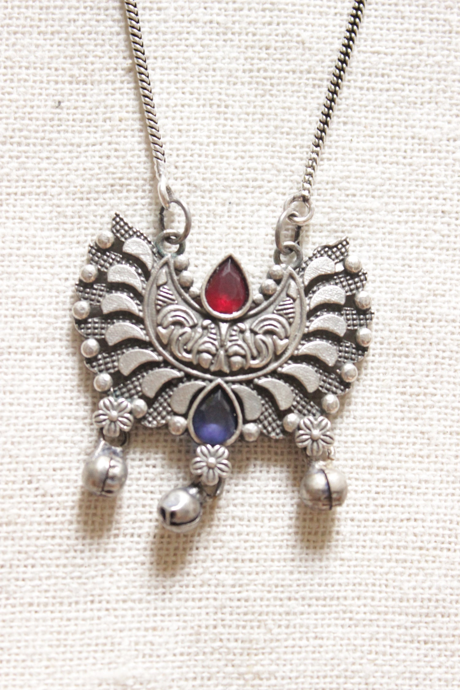 Oxidised Finish Dancing Peacock Feathers Shape Petite Silver Chain Necklace