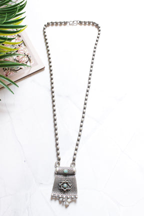 Oxidised Finish Dholki Beads German Silver Necklace with Blue Center Stone is backordered and will ship as soon as it is back in stock.