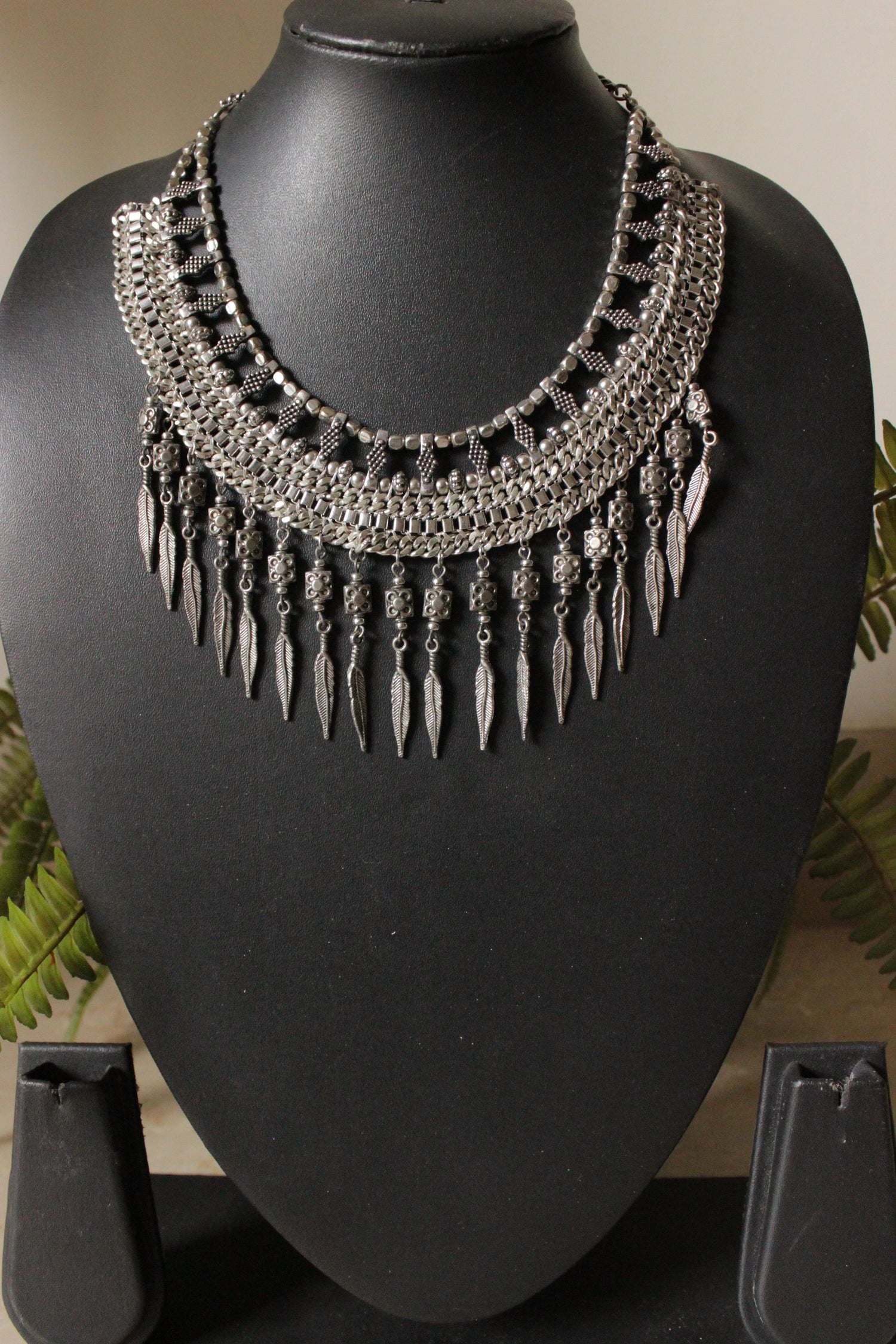 Oxidised Finish Elaborately Detailed Metal Choker Necklace with Adjustable Length Chain Closure