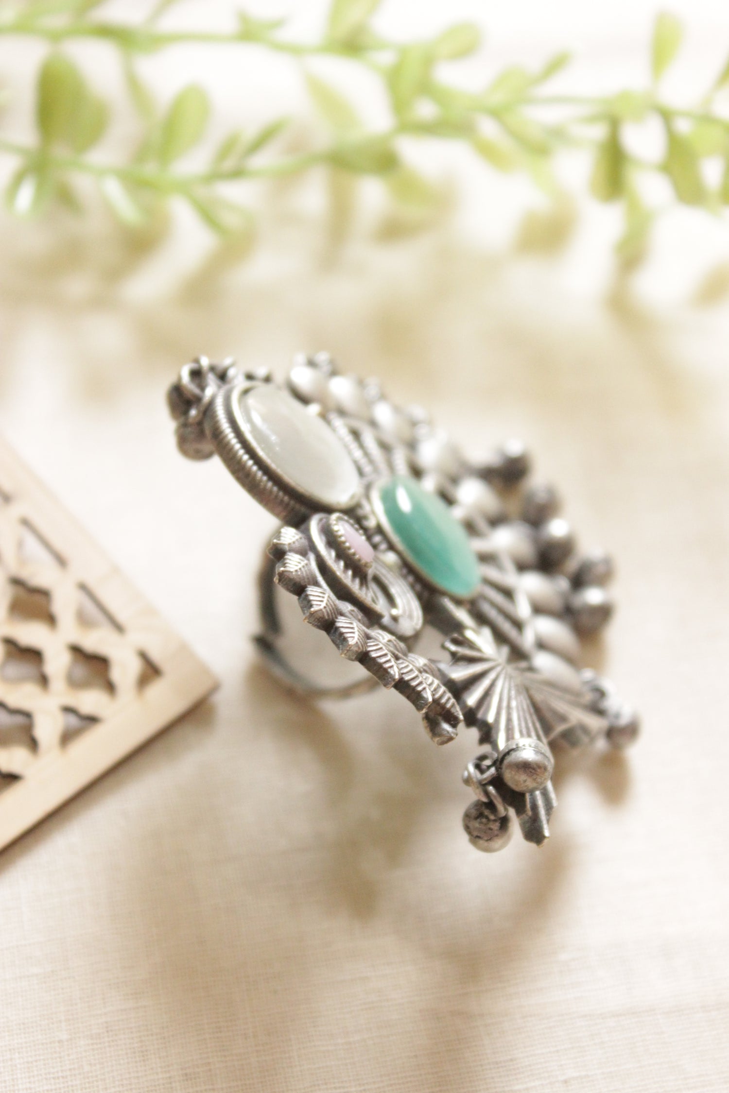 Oxidised Silver Finish Peacock & Ghungroo Beads Statement Cocktail Adjustable Ring