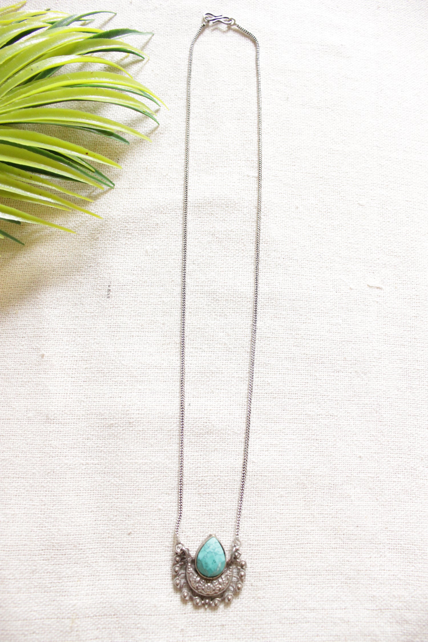 Peacock Feather Shape Petite Silver Chain Oxidised Finish Necklace Embellished with Turquoise Stone