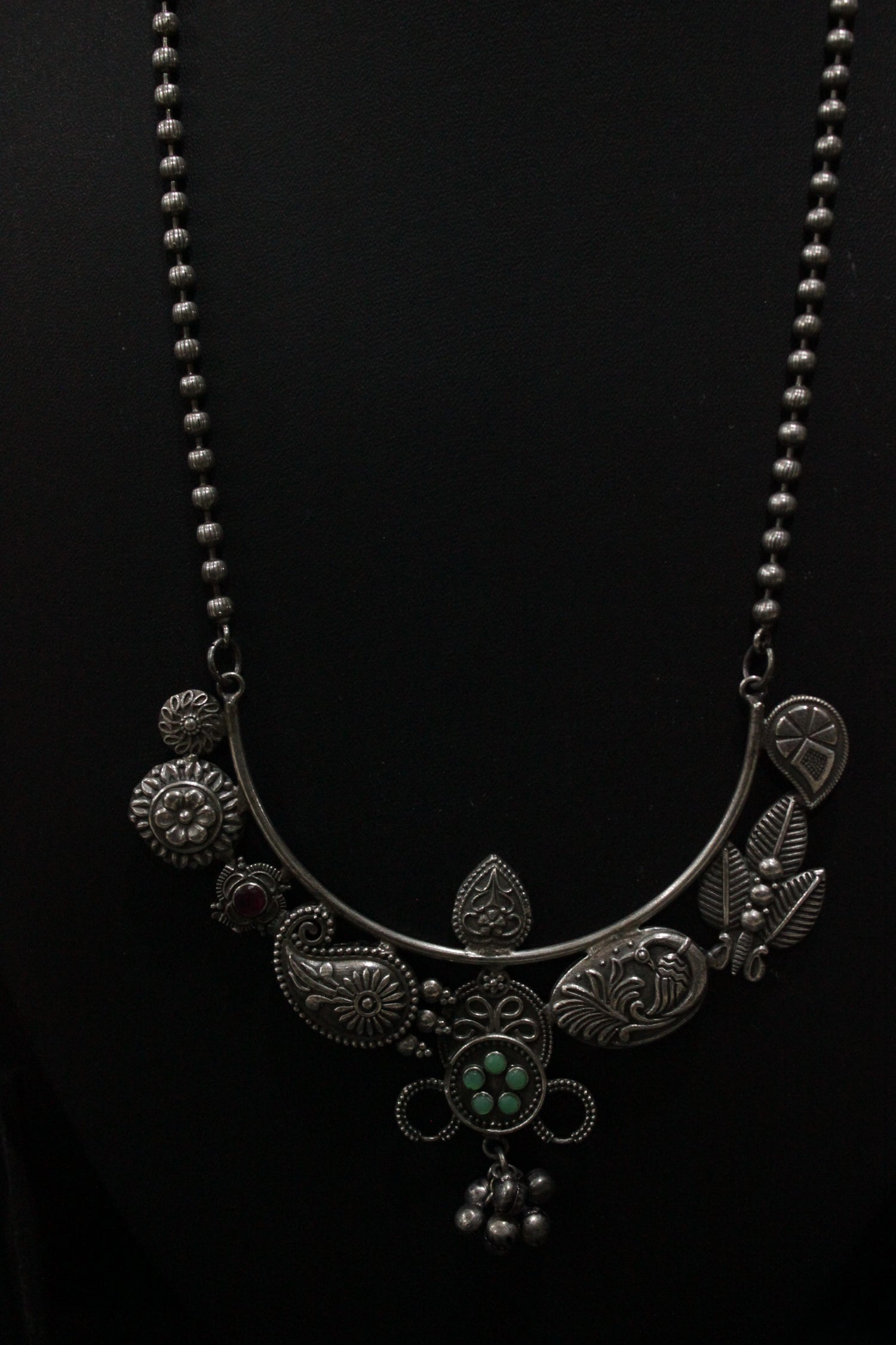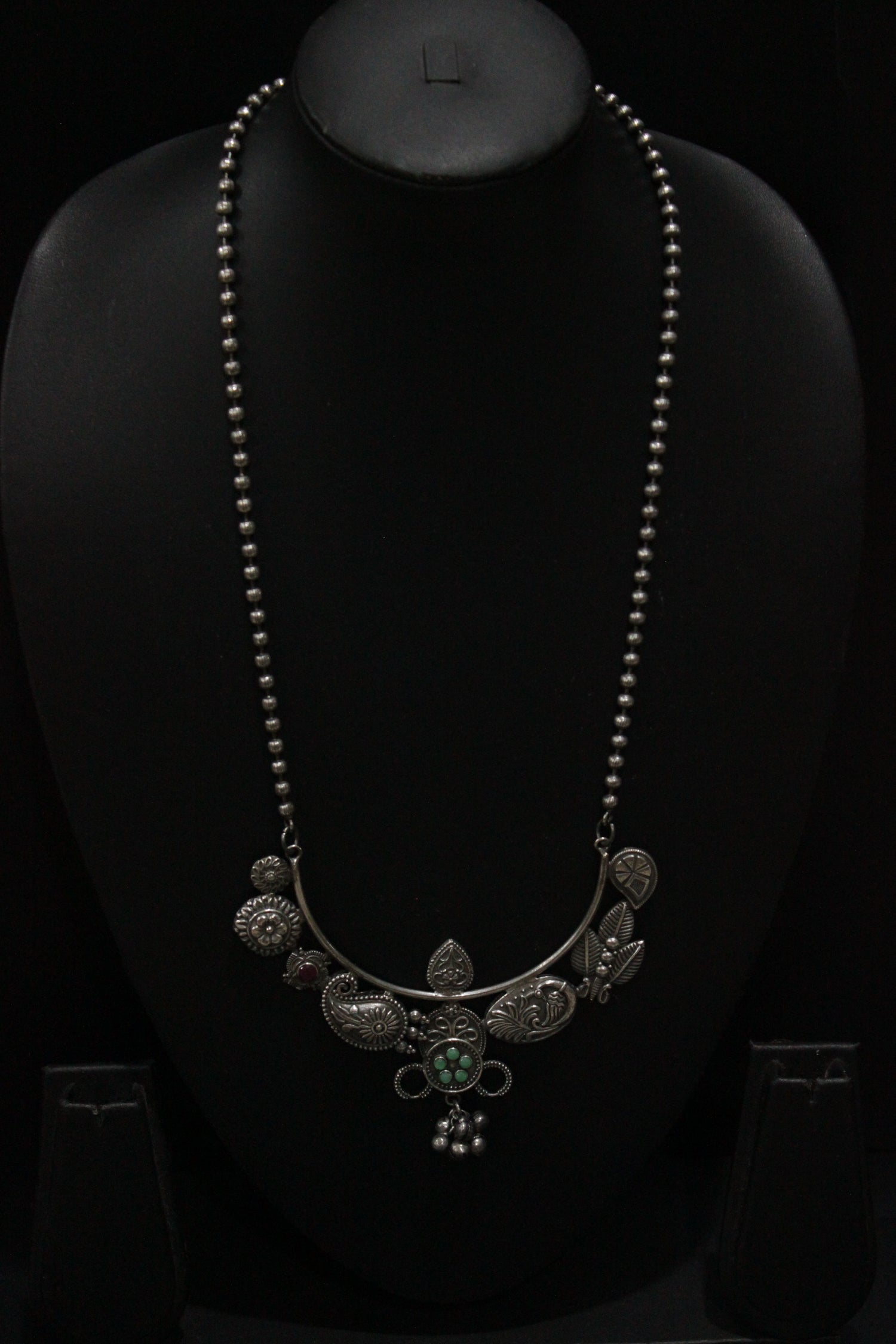 Peacock, Leaves & Flower Motifs Stones Embedded Oxidised Silver Finish Long Chain Necklace
